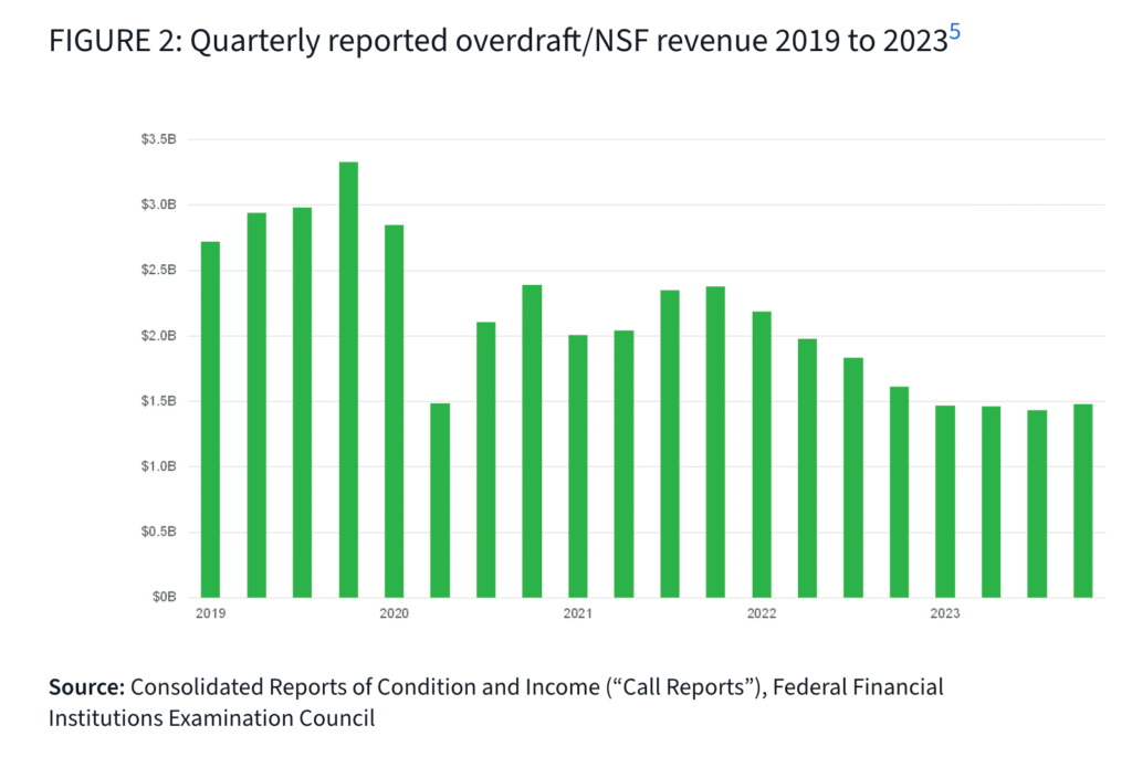 Figure: Annual reported overdraft/NSF revenue (U.S., 2015–2023)consumerfinance.gov. The chart highlights a >50% decline since 2019, yet persistent billions in fees remain.