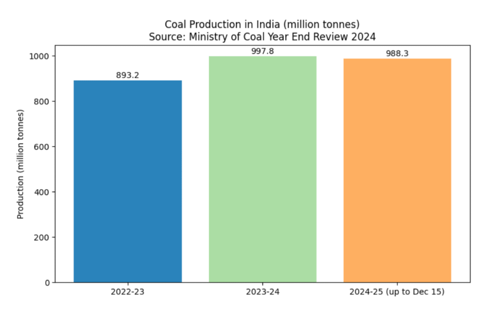 The SHAKTI (Scheme for Harnessing and Allocating Koyala Transparently in India) policy, implemented in 2017, sought to streamline coal supply to power plants by allocating long‑term coal linkages through auctions. According to the Ministry of Coal’s 2024 Year‑End Review, India produced 997.826 million tonnes of coal in 2023‑24 and aimed for 988 Mt in 2024‑25. The ministry emphasised that auctions have increased competition and revenue.