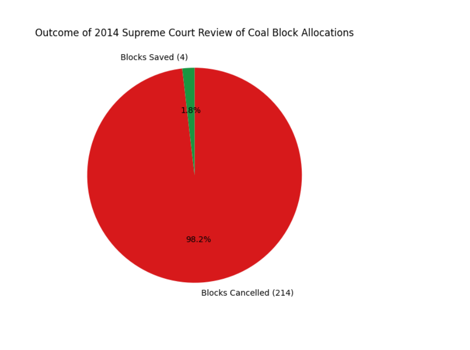In 2014 the Supreme Court cancelled 214 out of 218 coal block allocations and saved only four blocks. The pie chart below illustrates the magnitude of the cancellation and highlights the scale of the irregularities in allocations.