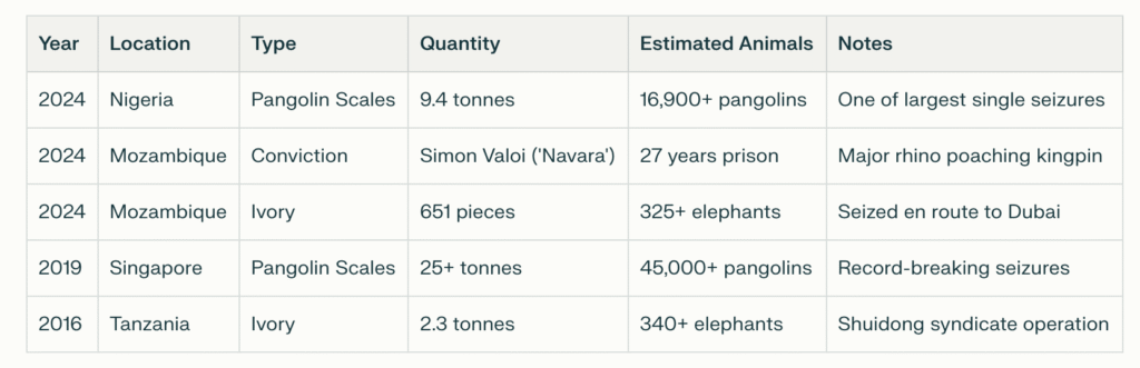 In December 2024 alone, Nigerian authorities intercepted 2.179 tonnes of pangolin scales, equivalent to approximately 1,100 pangolins, in a single operation targeting a suspected broker believed to be part of a network supplying vast quantities to Lagos-based trafficking organizations.